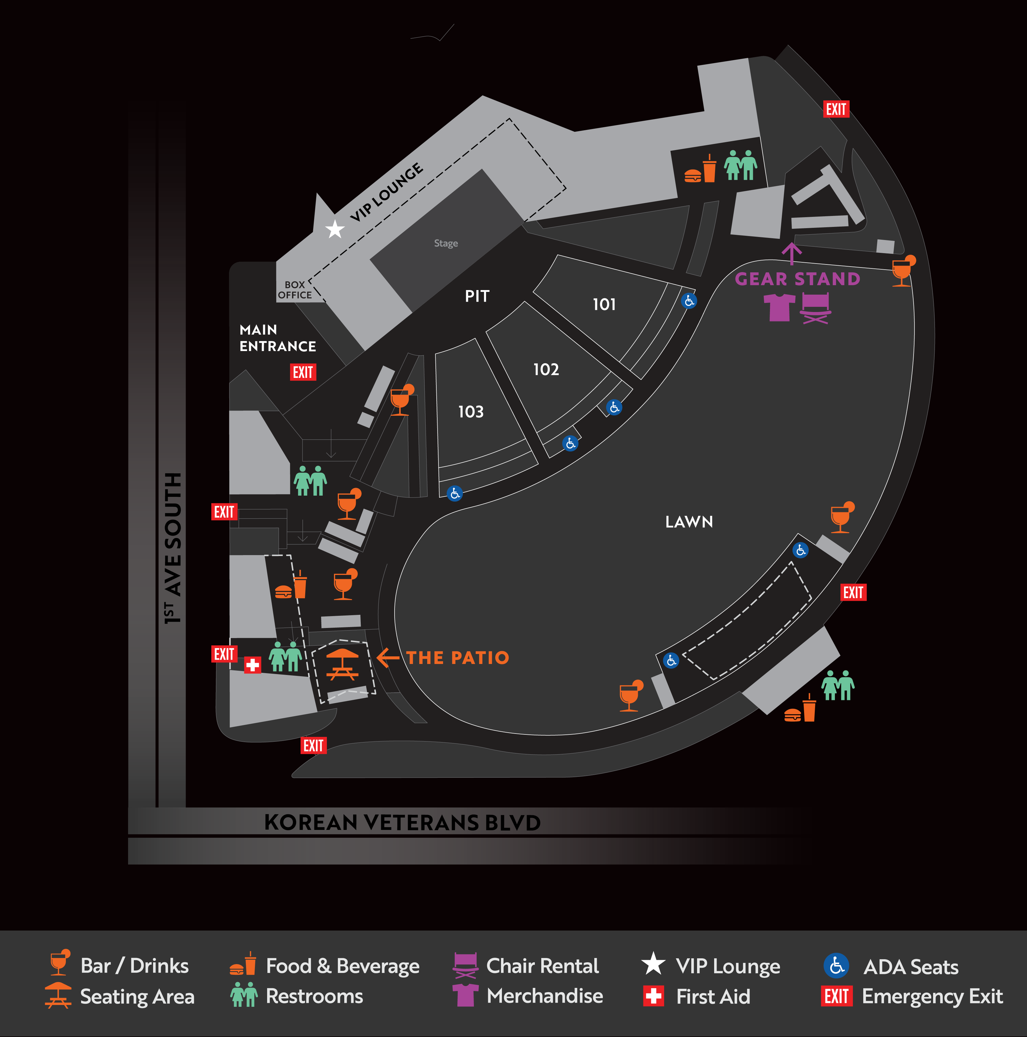 Guests with tickets should enter via Gate 1, located at the northwest corner of the venue, next to the box office. There is a secondary entrance on the corner of 1st Ave and Korean Veterans Blvd., in the southwest corner of the venue that guests with tickets may also enter through. The VIP Entrance is located left of the box office.